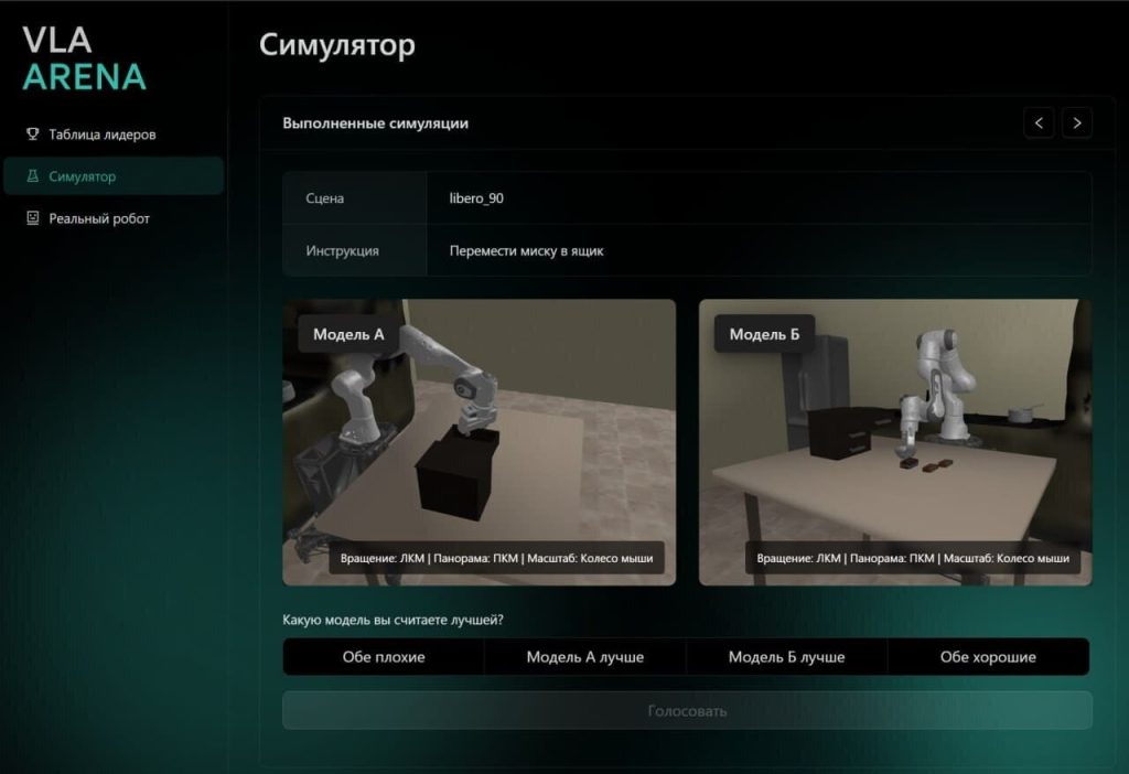 Можно запускать тесты на симуляции, подключать собственный робот и сравнивать качество работы разных моделей. Все оценки формируются на основе рандомизированных экспериментов, что повышает объективность результатов и формирует честную таблицу лидеров.