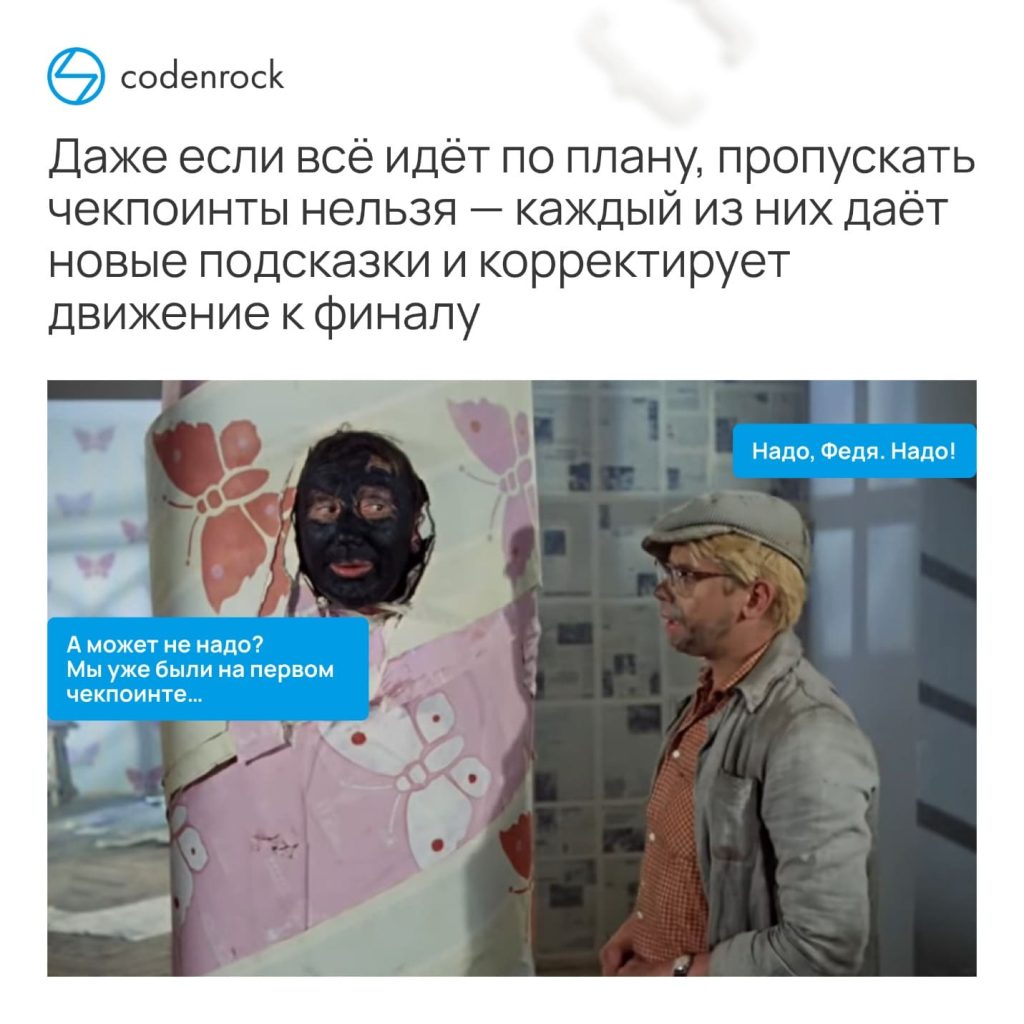 Велико искушение не записываться на чекпоинт: зачем тратить на него время, если начальный план согласован, проблемы решаются и вопросов нет? Ни в коем случае не делайте так — вы пропустите важный этап, от которого зависит качество финального проекта и его техническая зрелость.